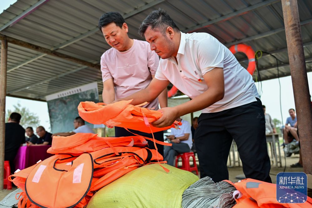 ↑在新疆阿克蘇地區(qū)沙雅縣蓋孜庫木鄉(xiāng)吐央村,搶險人員在整理防汛物資(8月3日攝)。