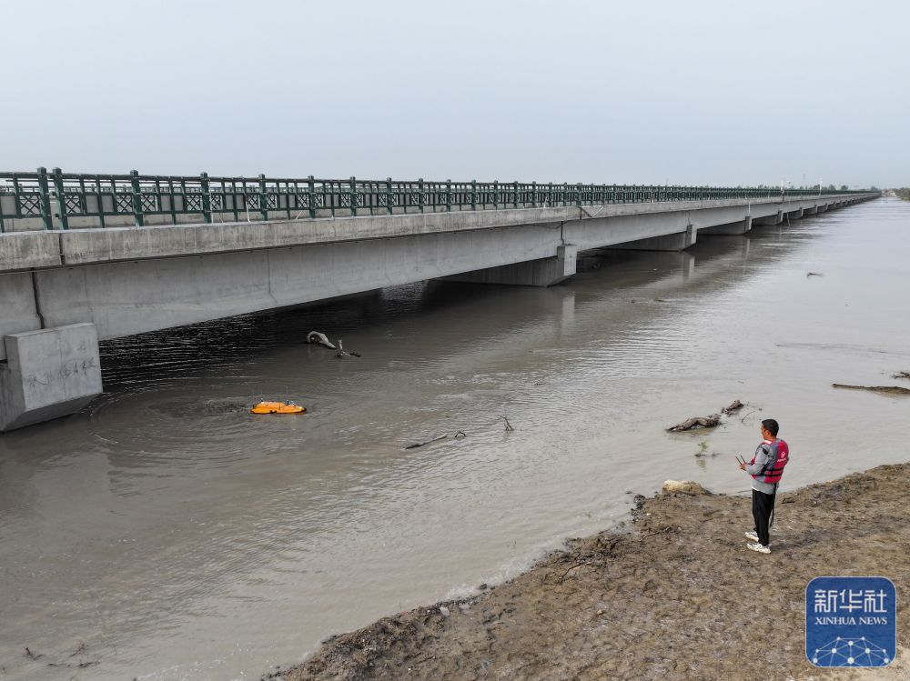 ↑在新疆阿克蘇地區(qū)沙雅縣蓋孜庫木鄉(xiāng),阿克蘇水文勘測局的工作人員在蓋孜庫木大橋防洪段收集水文信息(8月3日攝)。