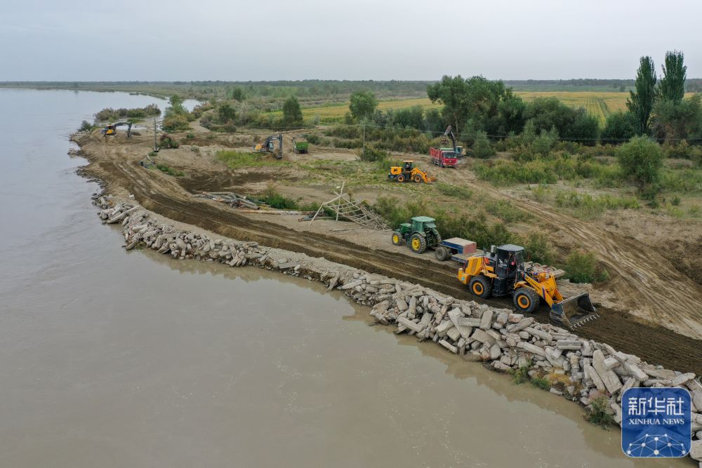 ↑在新疆阿克蘇地區(qū)沙雅縣蓋孜庫木鄉(xiāng)吐央村,搶險人員駕駛大型機械進行堤壩加固(8月3日攝,無人機照片)。
