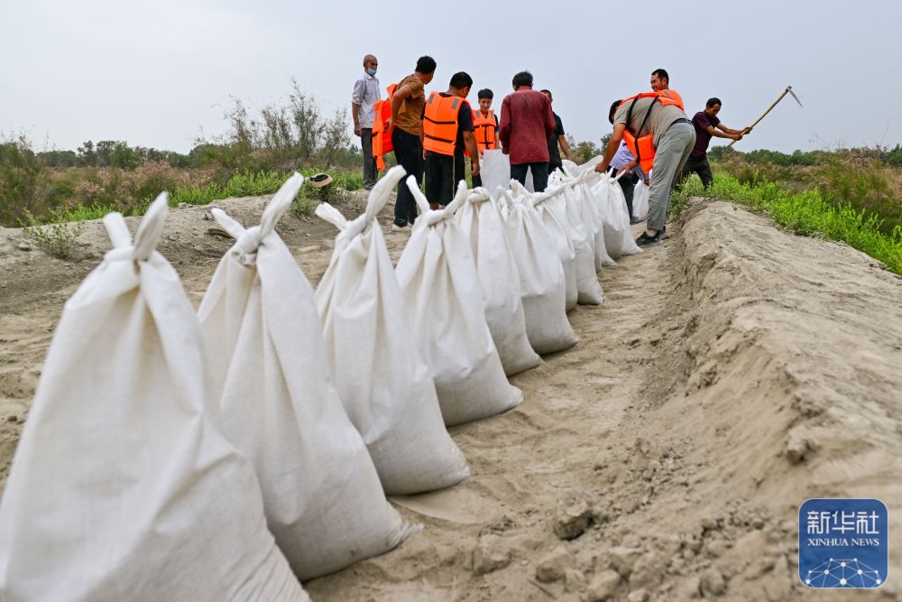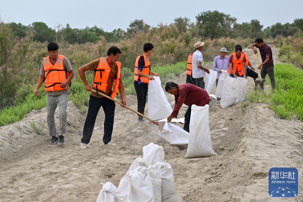 ↑在新疆阿克蘇地區(qū)沙雅縣蓋孜庫木鄉(xiāng)一處河堤除險加固現(xiàn)場,搶險人員在裝運沙袋(8月3日攝)。
