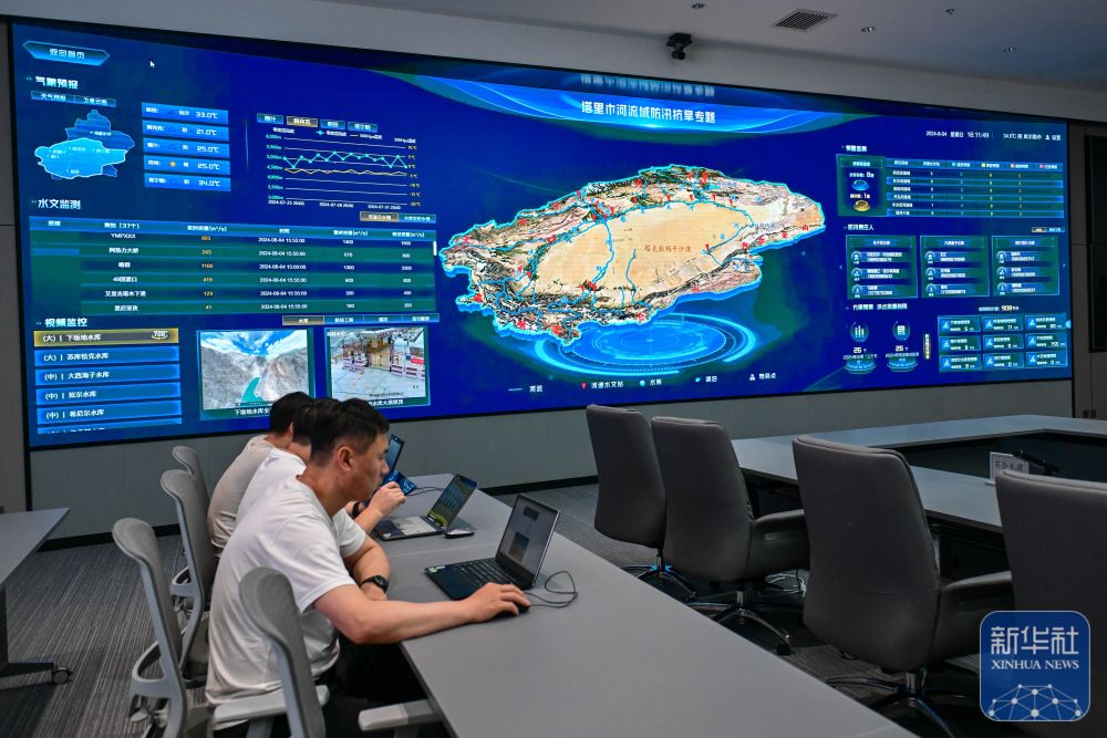 ↑在新疆塔里木河流域管理局,工作人員查看防汛實時數(shù)據(jù)(8月4日攝)。
