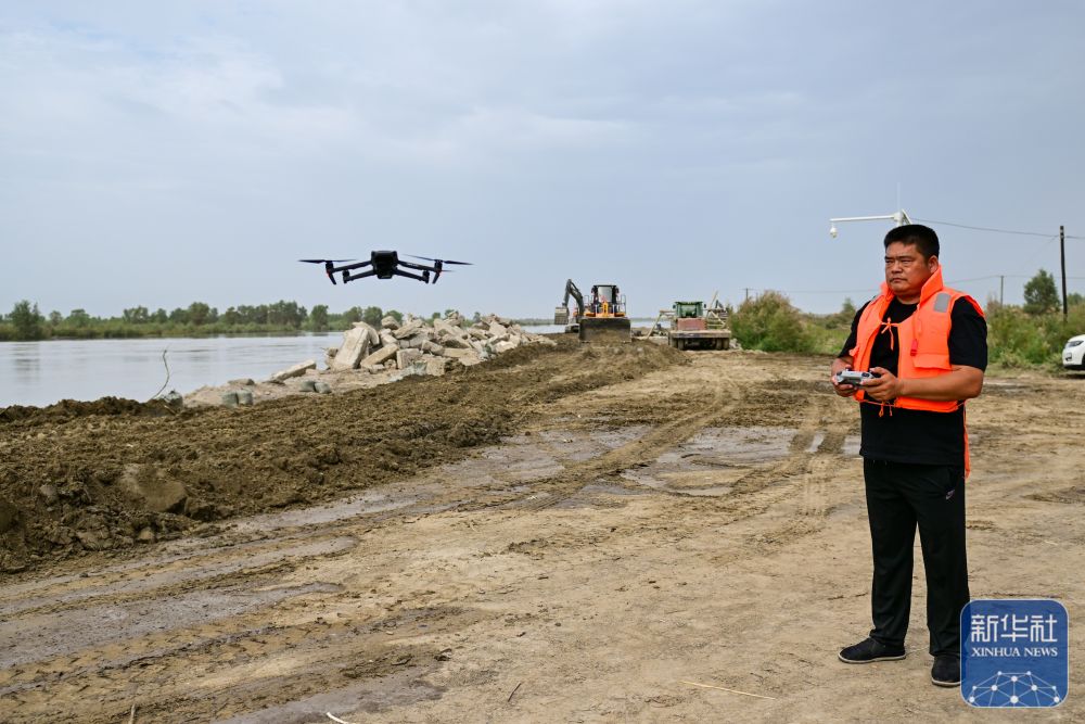 ↑在新疆阿克蘇地區(qū)沙雅縣蓋孜庫木鄉(xiāng)吐央村,搶險人員利用無人機進行巡查(8月3日攝)。