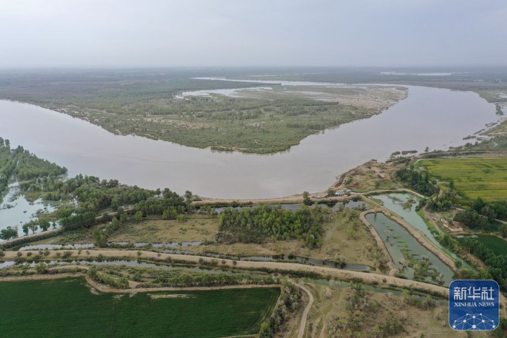 ↑這是在新疆阿克蘇地區(qū)沙雅縣拍攝的塔里木河。幾字形的回水灣,距離最近的農田不足50米(8月3日攝,無人機照片)。