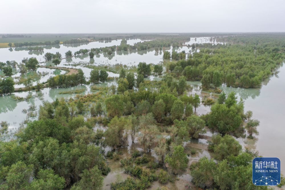 ↑8月1日拍攝的利用塔里木河洪水灌溉阿克蘇地區(qū)沙雅縣天然胡楊林的場景(無人機照片)。