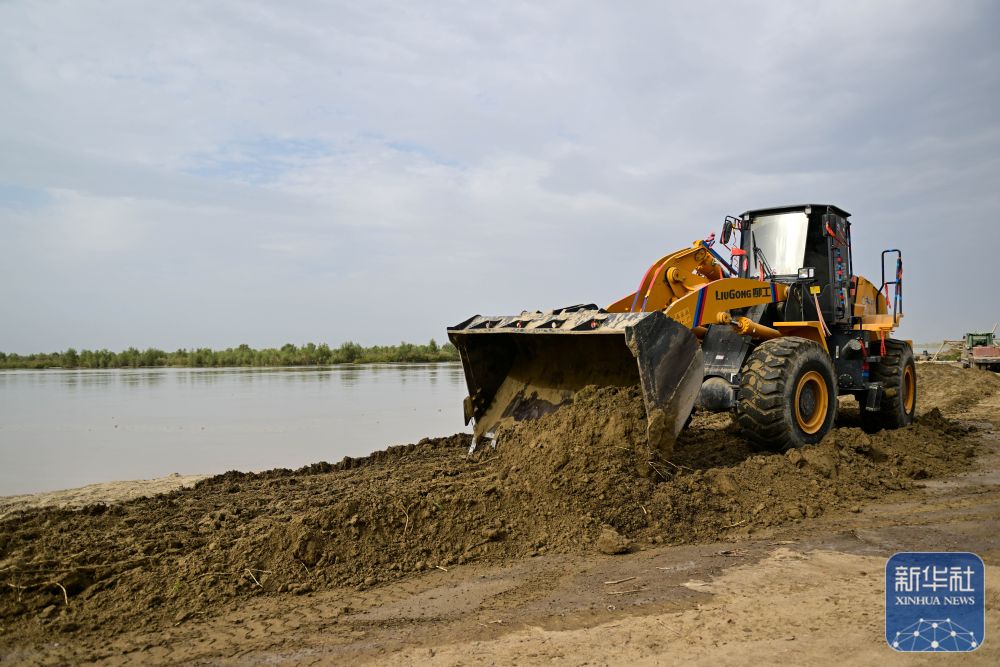 ↑在新疆阿克蘇地區(qū)沙雅縣蓋孜庫木鄉(xiāng)吐央村,搶險人員駕駛大型機械進行堤壩加固(8月3日攝)。