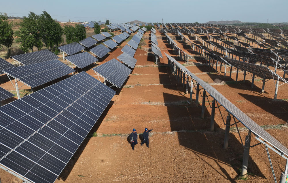 2024年4月16日,工人在河北省石家莊市靈壽縣譚莊鄉(xiāng)程家莊村的“農(nóng)光互補(bǔ)”光伏發(fā)電場巡查(無人機(jī)照片)。新華社記者 楊世堯 攝