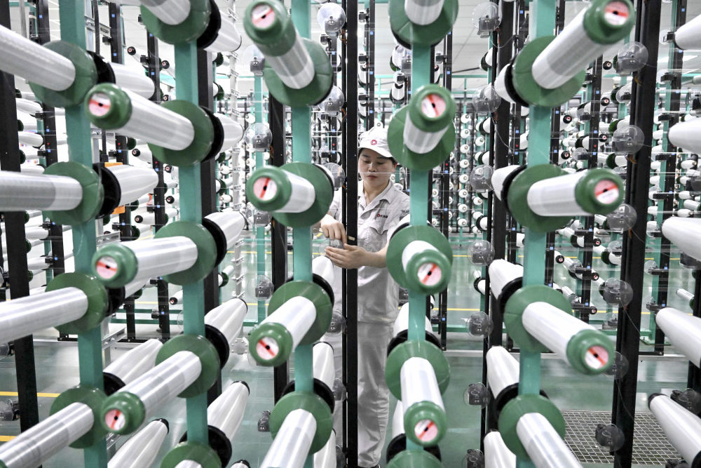 在位于河南安陽(yáng)林州市的河南光遠(yuǎn)新材料股份有限公司電子布準(zhǔn)備車(chē)間,工作人員在檢查整經(jīng)機(jī)機(jī)臺(tái)(2024年2月22日攝)。該公司通過(guò)自主技術(shù)創(chuàng)新,攻克“卡脖子”技術(shù),研發(fā)出5G用低介電電子紗、5G用超薄電子布等產(chǎn)品。新華社記者 李安 攝