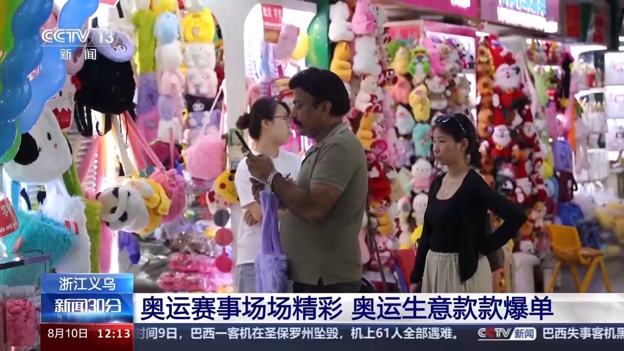 搭乘奧運(yùn)東風(fēng)的不僅是體育健兒的同款配飾,奧運(yùn)周邊產(chǎn)品也備受市場(chǎng)青睞。在義烏國(guó)際商貿(mào)城,這里匯集26個(gè)大類、210多萬(wàn)種商品,不僅滿足了全球觀眾和參賽者的需求,也給義烏商家?guī)?lái)了明顯的經(jīng)濟(jì)效益。