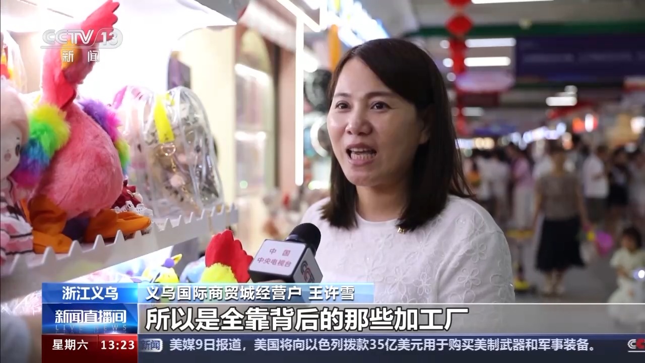義烏國(guó)際商貿(mào)城經(jīng)營(yíng)戶 王許雪:像我們背后都有100來(lái)家工廠給我們供應(yīng),所以是全靠背后的那些加工廠來(lái)支持我們,全國(guó)各地的都有。