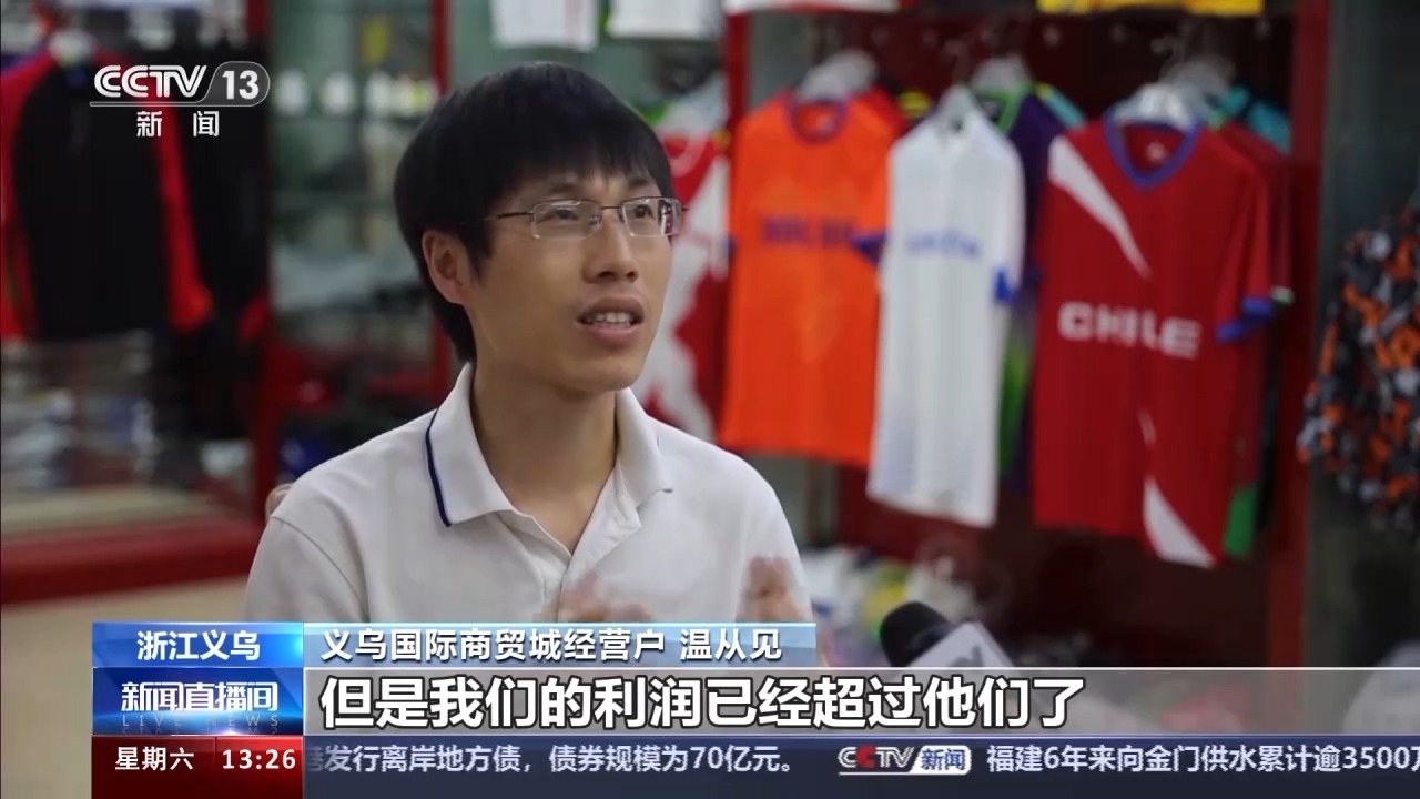 溫從見(jiàn)是義烏國(guó)際商貿(mào)城的一位經(jīng)營(yíng)戶,從事球衣服裝行業(yè)已經(jīng)17年,經(jīng)歷了多輪體育賽事的備貨、生產(chǎn)和銷售。得益于敏銳的反應(yīng)力和良好的適應(yīng)力,溫從見(jiàn)在今年大賽期間收益頗豐。