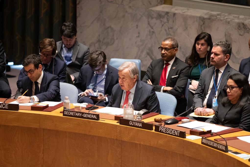 2月23日,在位于紐約的聯(lián)合國總部,聯(lián)合國秘書長古特雷斯(前排中)在烏克蘭問題高級別公開會上發(fā)言。烏克蘭危機(jī)升級兩周年之際,聯(lián)合國安理會23日舉行烏克蘭問題高級別公開會,與會多方呼吁通過政治手段解決烏克蘭危機(jī)。新華社記者謝鍔攝