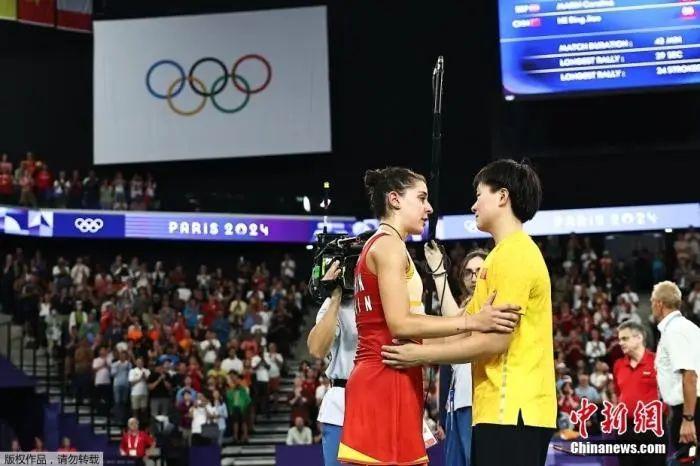面對痛苦跪地、嚎啕大哭的馬林,何冰嬌主動走上前,用一個溫暖的擁抱給予對手安慰與尊重,展現(xiàn)出中國運動員的風(fēng)度和胸襟。