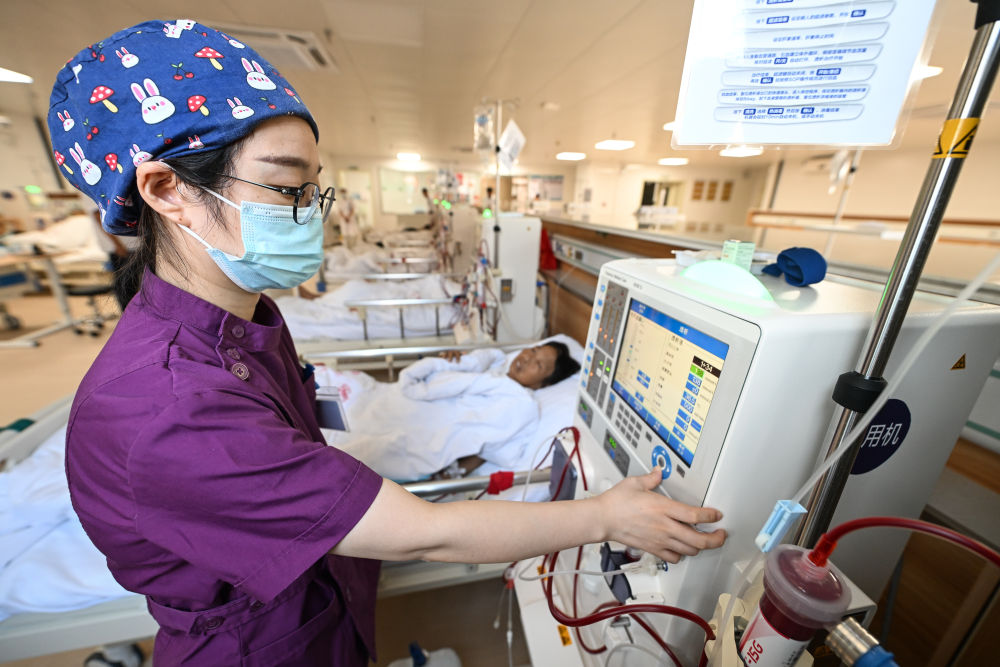 江蘇海安市曲塘中心衛(wèi)生院護(hù)士在血液透析中心操作設(shè)備(2024年7月31日攝)。海安加快優(yōu)質(zhì)醫(yī)療資源下沉,對基層醫(yī)療機(jī)構(gòu)管理、技術(shù)等方面進(jìn)行幫扶。數(shù)據(jù)顯示,2023年海安市縣域內(nèi)就診率為90.54%,基層醫(yī)療衛(wèi)生機(jī)構(gòu)門急診占比為74.86%。新華社記者 季春鵬 攝