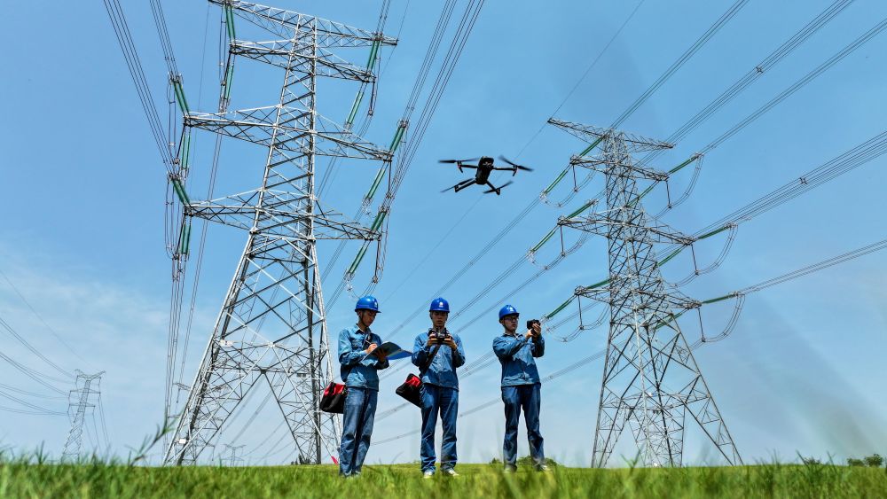 面對安徽、江蘇持續(xù)高溫,皖蘇兩省的電力工人聯(lián)合對省際聯(lián)絡(luò)線及相關(guān)配電設(shè)施進(jìn)行檢修,并開展輸變電設(shè)施巡視檢查。這是在安徽省滁州市南譙區(qū),電力工人運用無人機(jī)對500千伏輸電線路進(jìn)行巡視檢查(2024年8月9日攝)。新華社記者 曹力 攝
