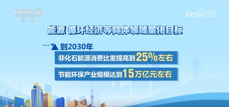 《意見》還針對(duì)能源、循環(huán)經(jīng)濟(jì)等具體領(lǐng)域提出一些量化目標(biāo)。比如,到2030年,非化石能源消費(fèi)比重提高到25%左右;節(jié)能環(huán)保產(chǎn)業(yè)規(guī)模達(dá)到15萬(wàn)億元左右。