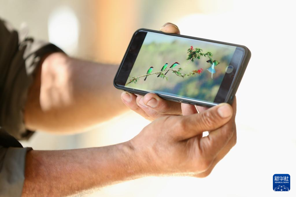 8月12日,福建南平市延平區(qū)爐下鎮(zhèn)斜溪村村民王崇年展示手機(jī)里攝影愛(ài)好者發(fā)來(lái)的藍(lán)喉蜂虎照片。 新華社記者 姜克紅 攝