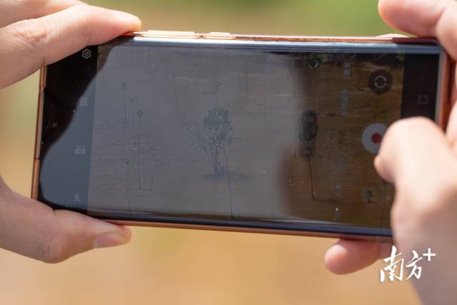 李明霖用手機(jī)拍下剛復(fù)種不久的“樹寶寶”。通過不同時(shí)間的影像對(duì)比,他們可以監(jiān)測(cè)紅樹林總體長(zhǎng)勢(shì)。