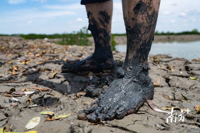 黑泥爬滿了楊健宏的小腿。