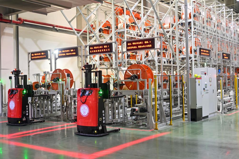 7月26日,無(wú)人叉車在杭州中策錢塘實(shí)業(yè)有限公司輪胎數(shù)字工廠車間內(nèi)裝運(yùn)物料。新華社記者 江漢 攝