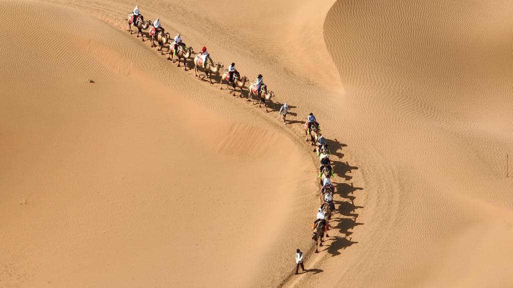 7月26日,游客在寧夏中衛(wèi)市沙坡頭景區(qū)體驗(yàn)騎駱駝。新華社記者 呂帥 攝