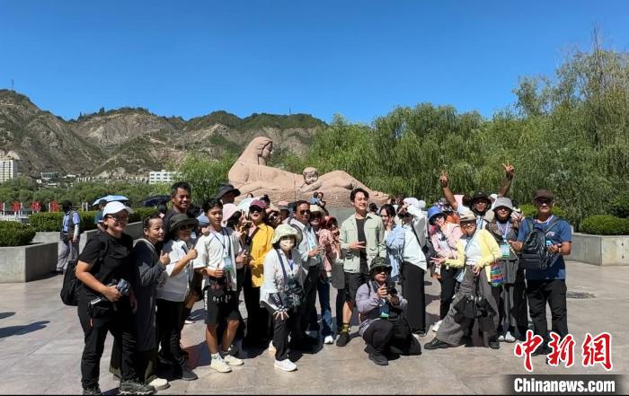 8月18日,臺胞在黃河母親雕塑前合影。王牧雨 攝