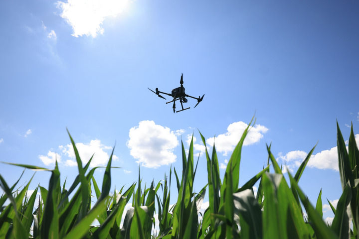 在黑龍江北大荒集團(tuán)趙光農(nóng)場有限公司農(nóng)業(yè)科技園區(qū),一臺智能無人機(jī)按照規(guī)定時間、規(guī)定路線進(jìn)行自動巡田作業(yè)(2024年7月22日攝)。新華社發(fā)(錢泊羽攝)