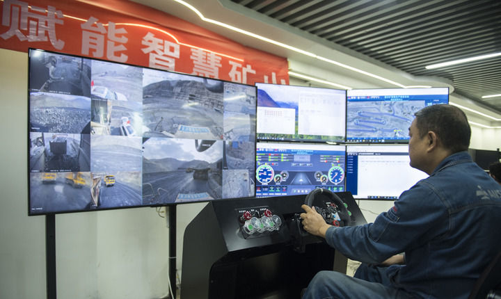 2024年4月11日,技術(shù)人員在位于四川省攀枝花市的攀鋼礦業(yè)朱蘭鐵礦智慧管控中心遠程操控?zé)o人自動駕駛礦車。新華社記者 張豪夫 攝