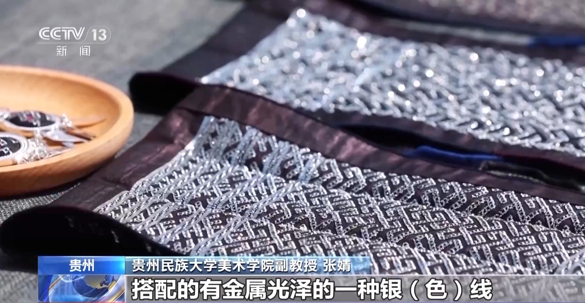 貴州民族大學(xué)美術(shù)學(xué)院副教授 張婧:錫繡會(huì)用到一些藏青色的底布、暗色系的絲線,搭配有金屬光澤的一種銀色線,以此形成強(qiáng)烈對(duì)比。對(duì)中國傳統(tǒng)刺繡、苗族刺繡來說,它的藝術(shù)風(fēng)格都是具有自己鮮明特征的。