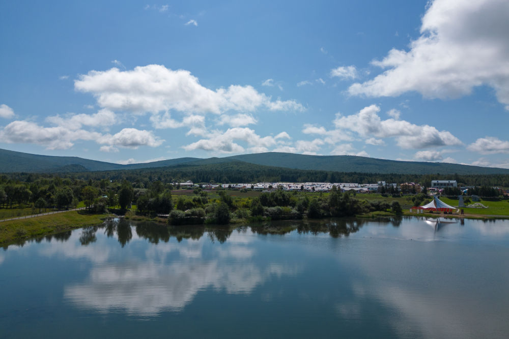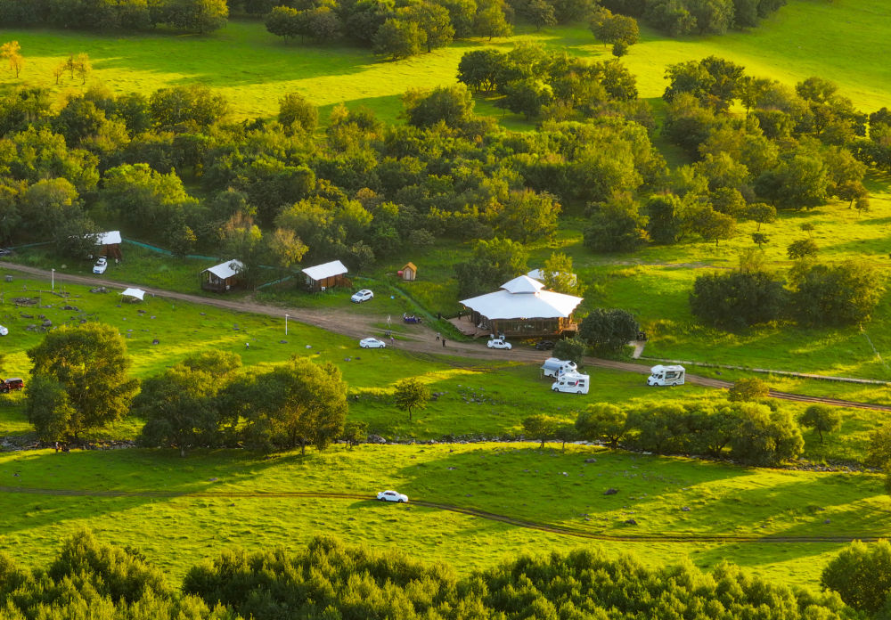 這是8月27日拍攝的黑龍江伊春森工集團(tuán)上甘嶺林業(yè)局公司溪水林場(chǎng)的溪水野奢帳篷度假酒店項(xiàng)目(無人機(jī)照片)。