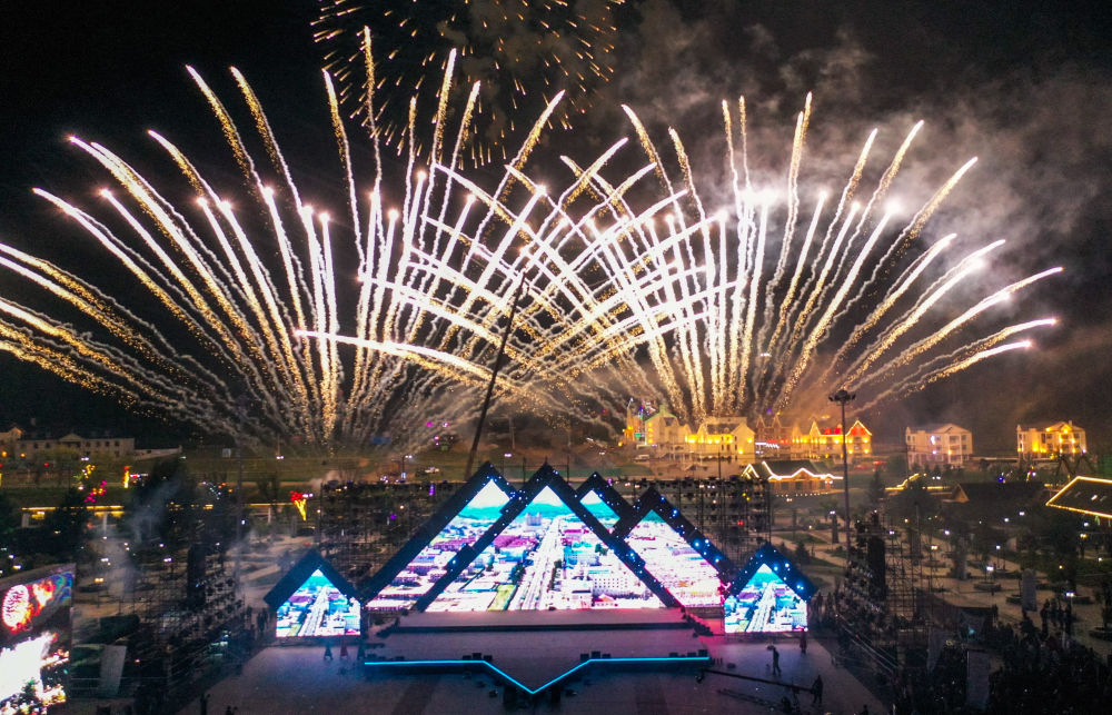 在內(nèi)蒙古興安盟阿爾山市拍攝的2023年中國(阿爾山)旅游大會(huì)開幕前一晚的焰火表演(2023年9月1日攝,無人機(jī)照片)。
