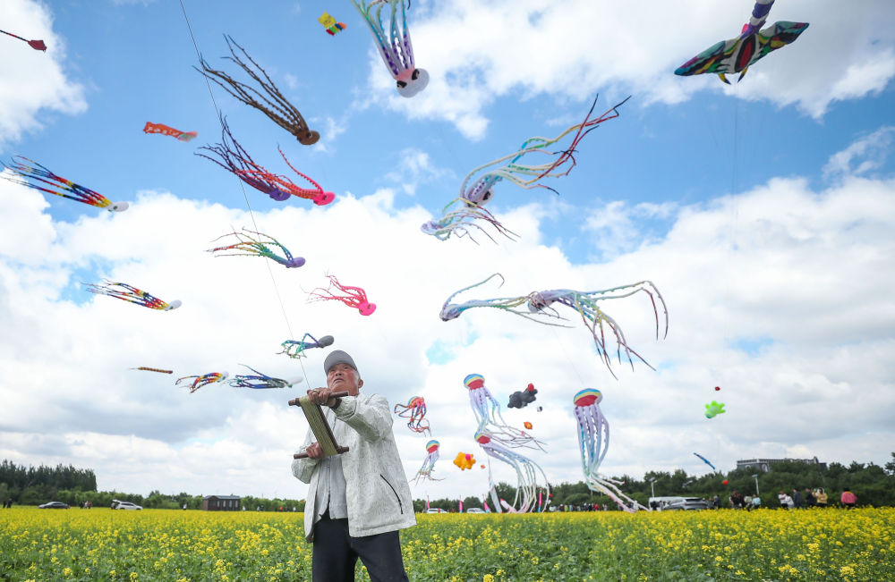 在遼寧省康平縣,一名風(fēng)箏愛好者在風(fēng)箏節(jié)活動(dòng)現(xiàn)場(chǎng)放風(fēng)箏(5月31日攝)。