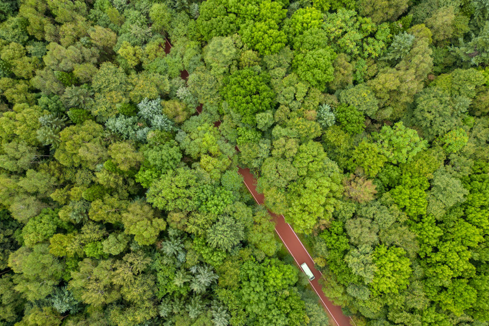 8月27日,游客乘坐電瓶車在黑龍江伊春市上甘嶺溪水國家森林公園內(nèi)穿行(無人機(jī)照片)。