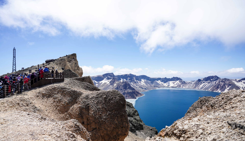 游客在長白山天池景區(qū)觀賞(5月24日攝)。