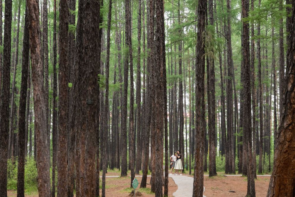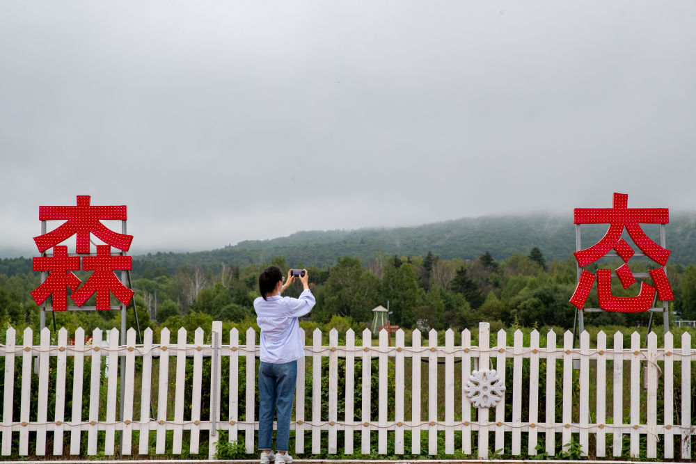 8月27日,游客在黑龍江伊春市上甘嶺溪水國家森林公園內(nèi)拍照。