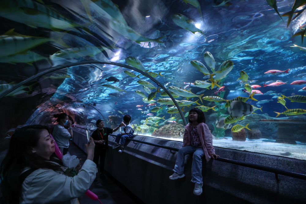 游客在大連圣亞海洋世界觀賞海洋魚類(5月22日攝)。
