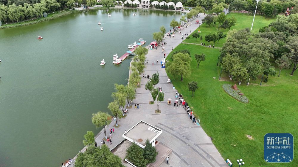 人們?cè)邶埥ぜ瘓F(tuán)綏棱林業(yè)局生態(tài)文化旅游景區(qū)一處公園游覽(7月25日攝,無人機(jī)照片)。