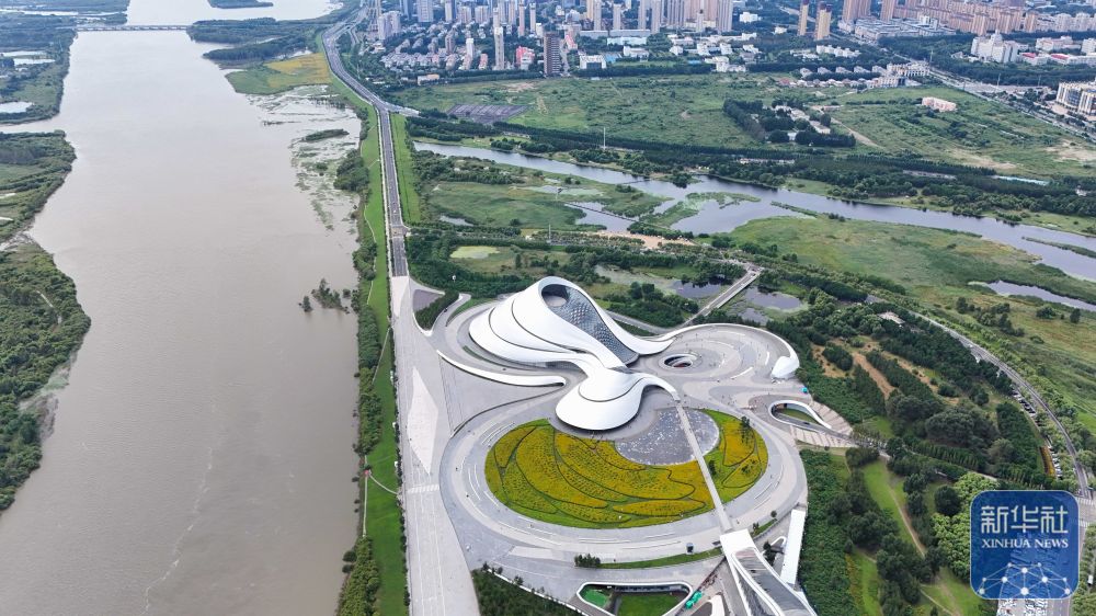 ↑這是哈爾濱大劇院臨江景色(8月20日攝,無人機(jī)照片)。