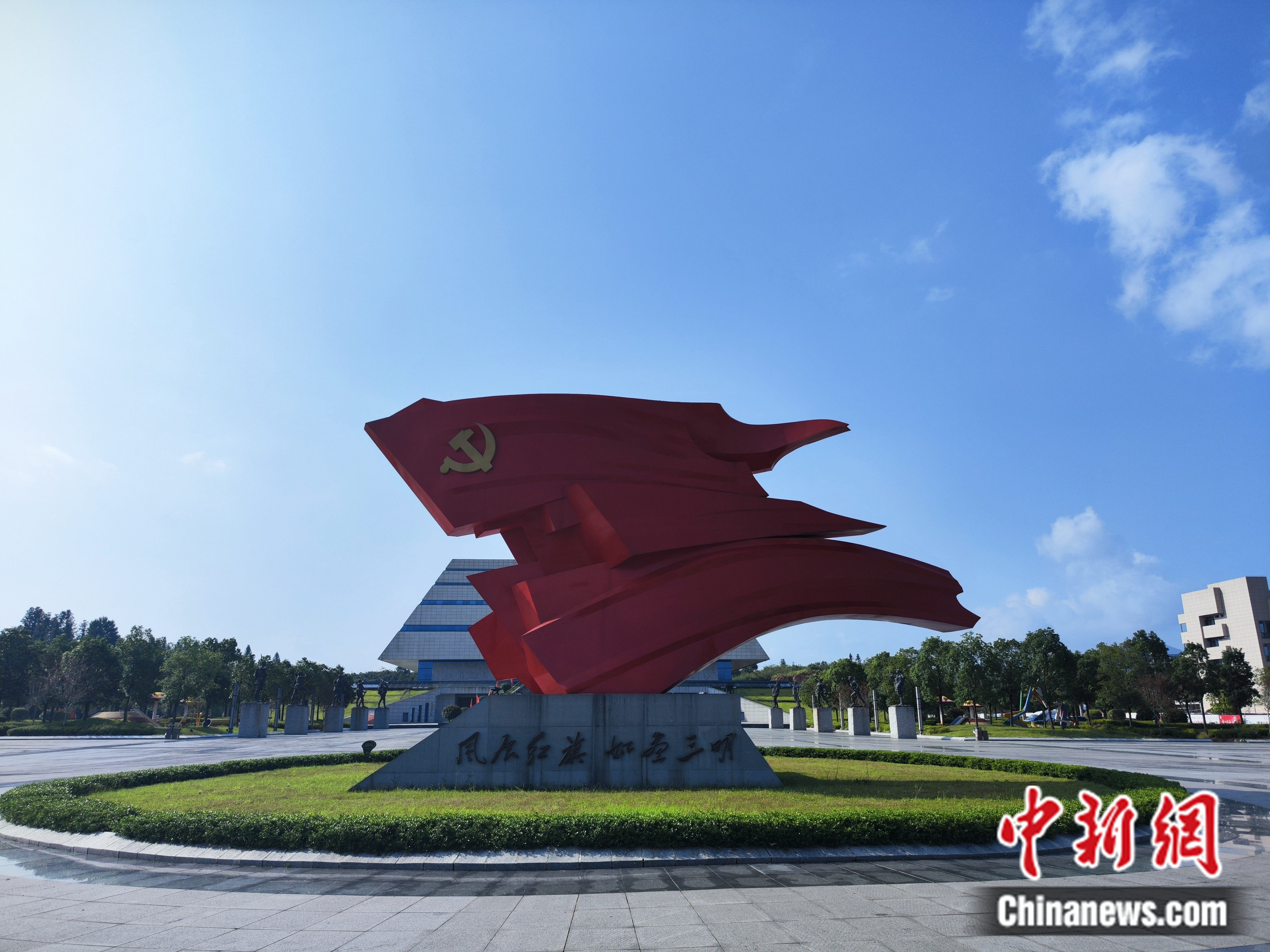 寧化縣長(zhǎng)征精神教育基地外,一則“紅旗”主題雕塑引人注目。劉越 攝