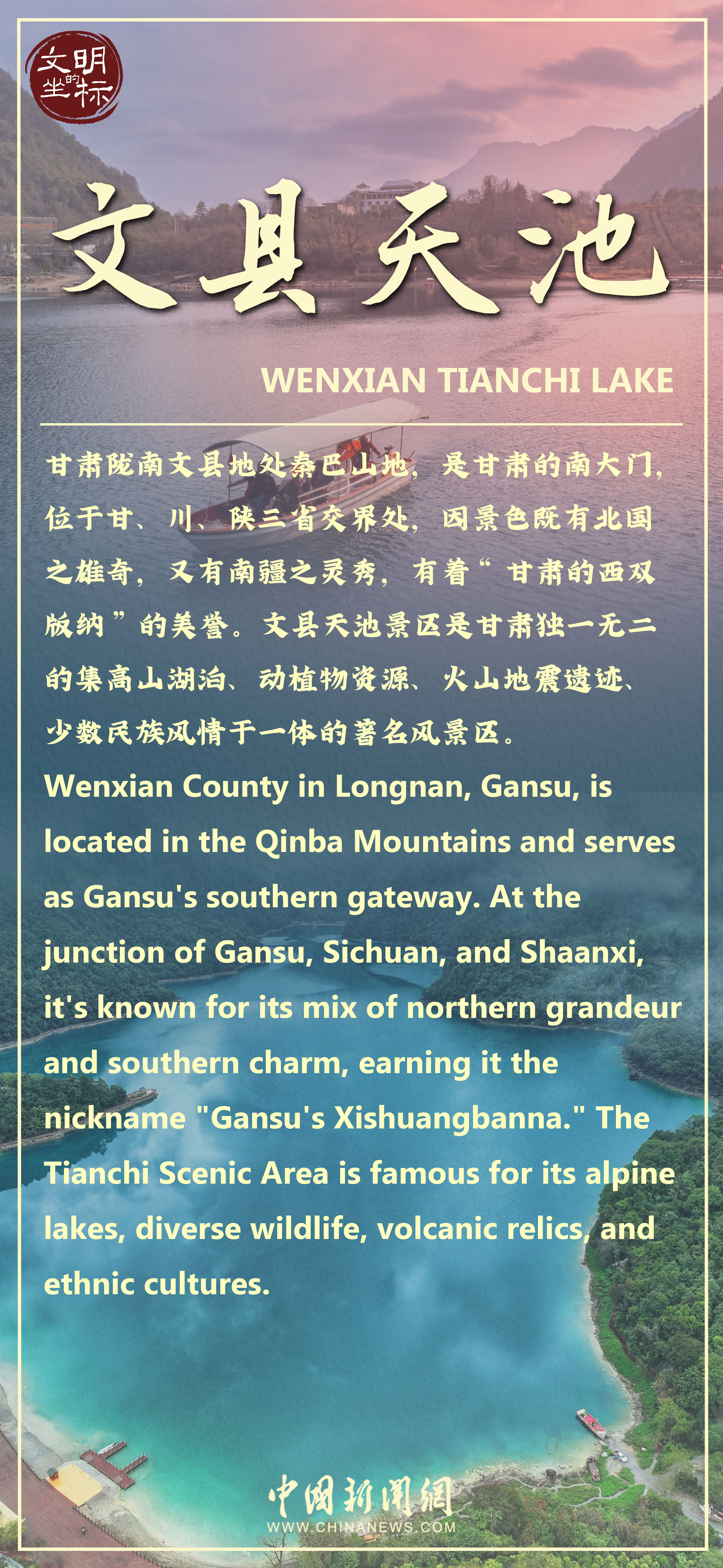 藏在甘肅隴南的文縣天池,被譽為西北“藍寶石”,風光旖旎如江南水鄉(xiāng)。它坐落在海拔2400米的高山上,九曲十八彎,水面碧波蕩漾,清澈見底。天池有“五奇”;一奇是入水甚少,出水極大,漲不見溢,枯不見涸;二奇是終年碧水,湖面無雜葉;三奇是有風無狂浪,無風偶起波;四奇是湖底有暗流,湖心有水涌;五奇是冬季不結冰,遇雨如夢幻。一湖碧水釀五奇,來這片天然仙境品味寧靜與神秘。