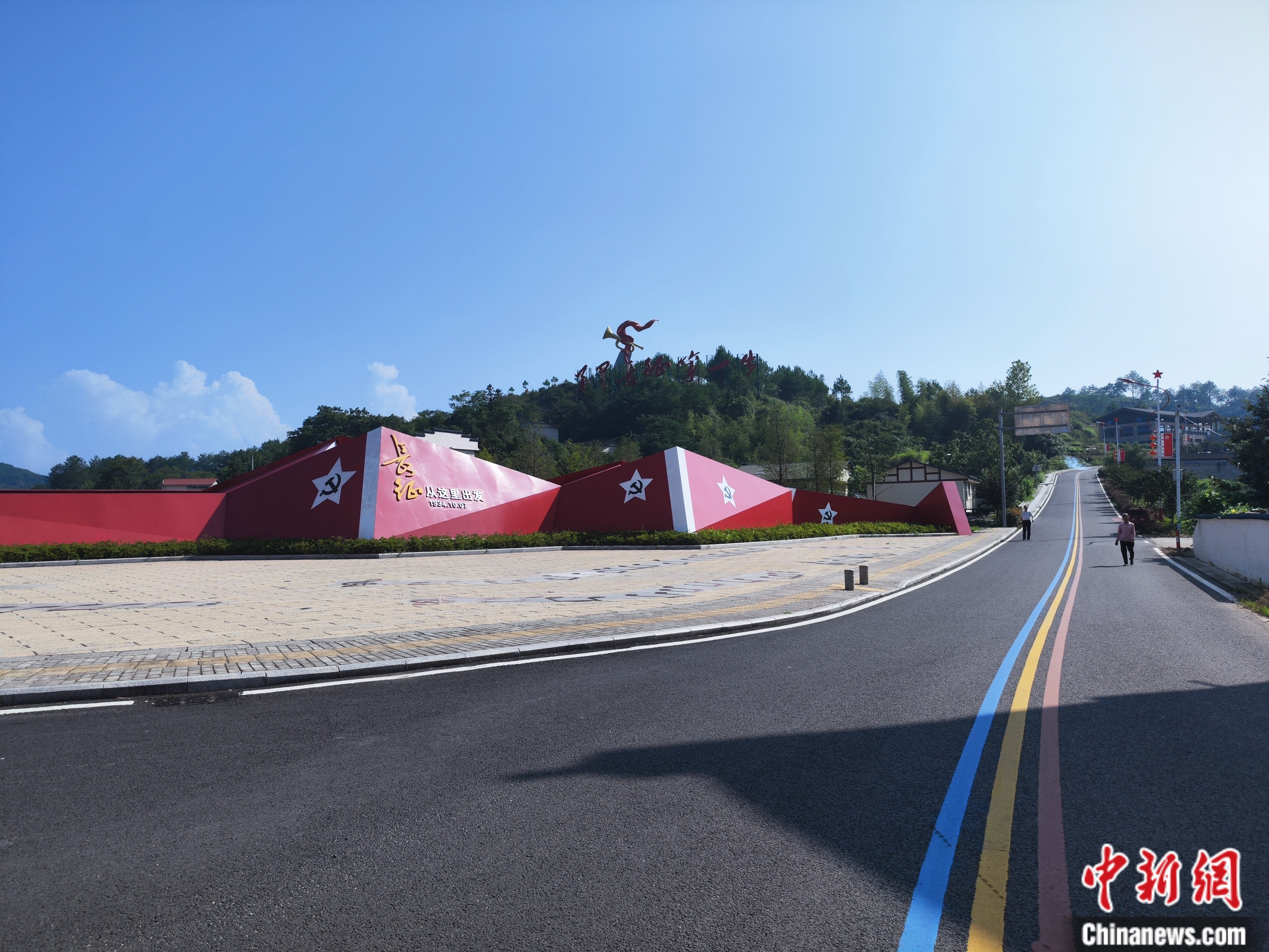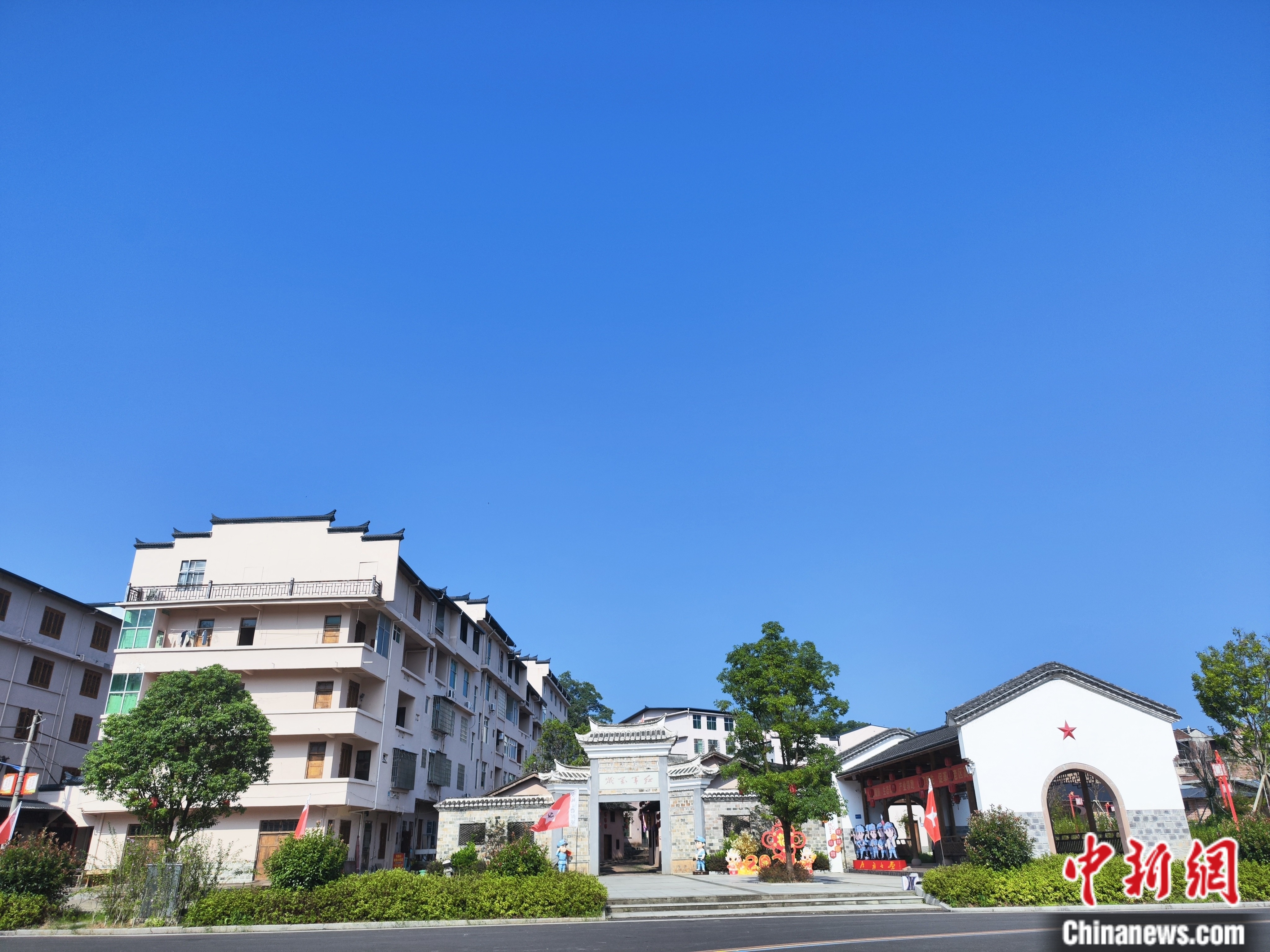 放眼望去,良田美池,碧樹繁花,阡陌交通,屋舍儼然,長征主題壁畫、標語隨處可見。而最引人注目的,還是那條長達千米的“紅軍街”。