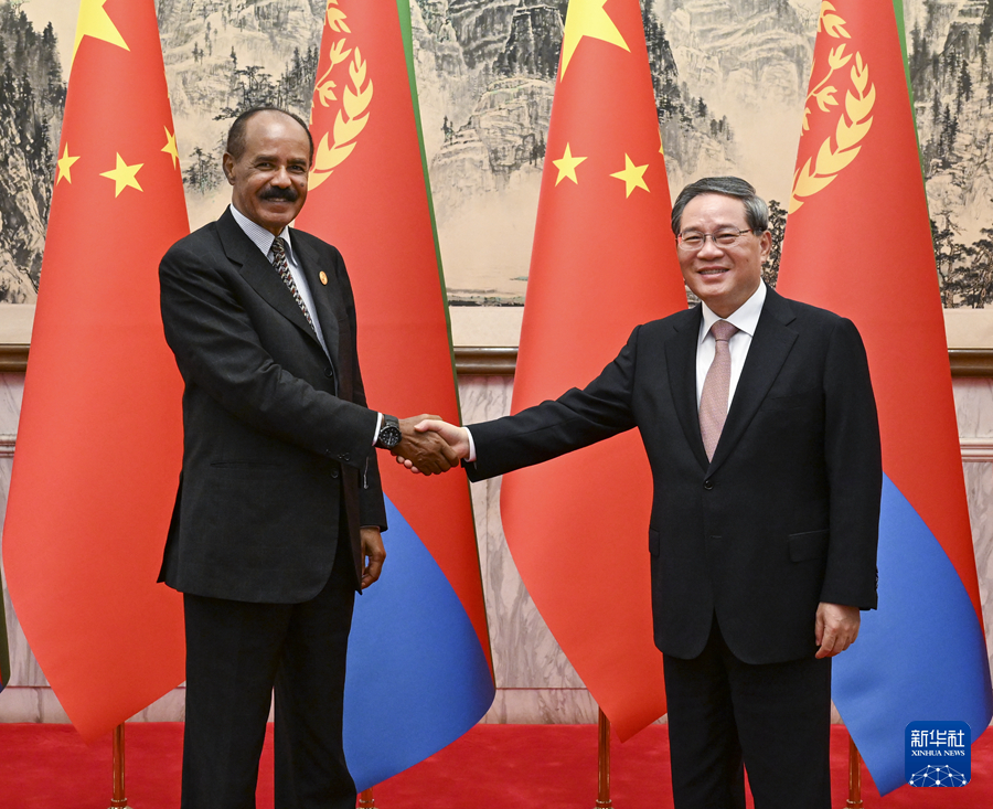 國(guó)務(wù)院總理李強(qiáng)9月3日上午在北京釣魚臺(tái)國(guó)賓館會(huì)見(jiàn)來(lái)華出席中非合作論壇北京峰會(huì)的厄立特里亞總統(tǒng)伊薩亞斯。