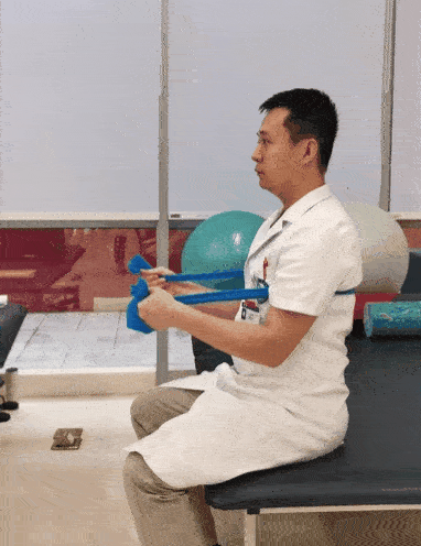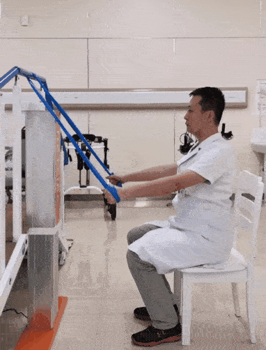 將彈力帶繞過身體前方的橫桿等固定物體,兩端纏繞于雙手上。坐位,身體保持正直,兩手緩慢向下拉動(dòng)彈力帶,直至彈力帶呈緊繃狀態(tài)。然后,緩慢還原至初始姿勢(shì)。此為一個(gè)完整動(dòng)作。8~12次/組,做3組。