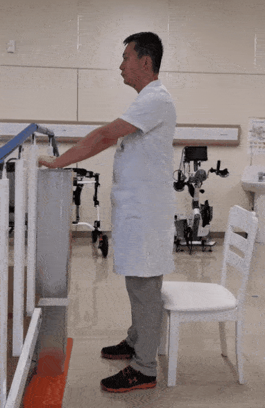 雙腳分開,雙手扶在墻面或扶手上,保證平衡。足跟緩慢抬起,停留一會(huì)兒,然后恢復(fù)至初始動(dòng)作。此為一個(gè)完整動(dòng)作。8~12次/組,做3組。