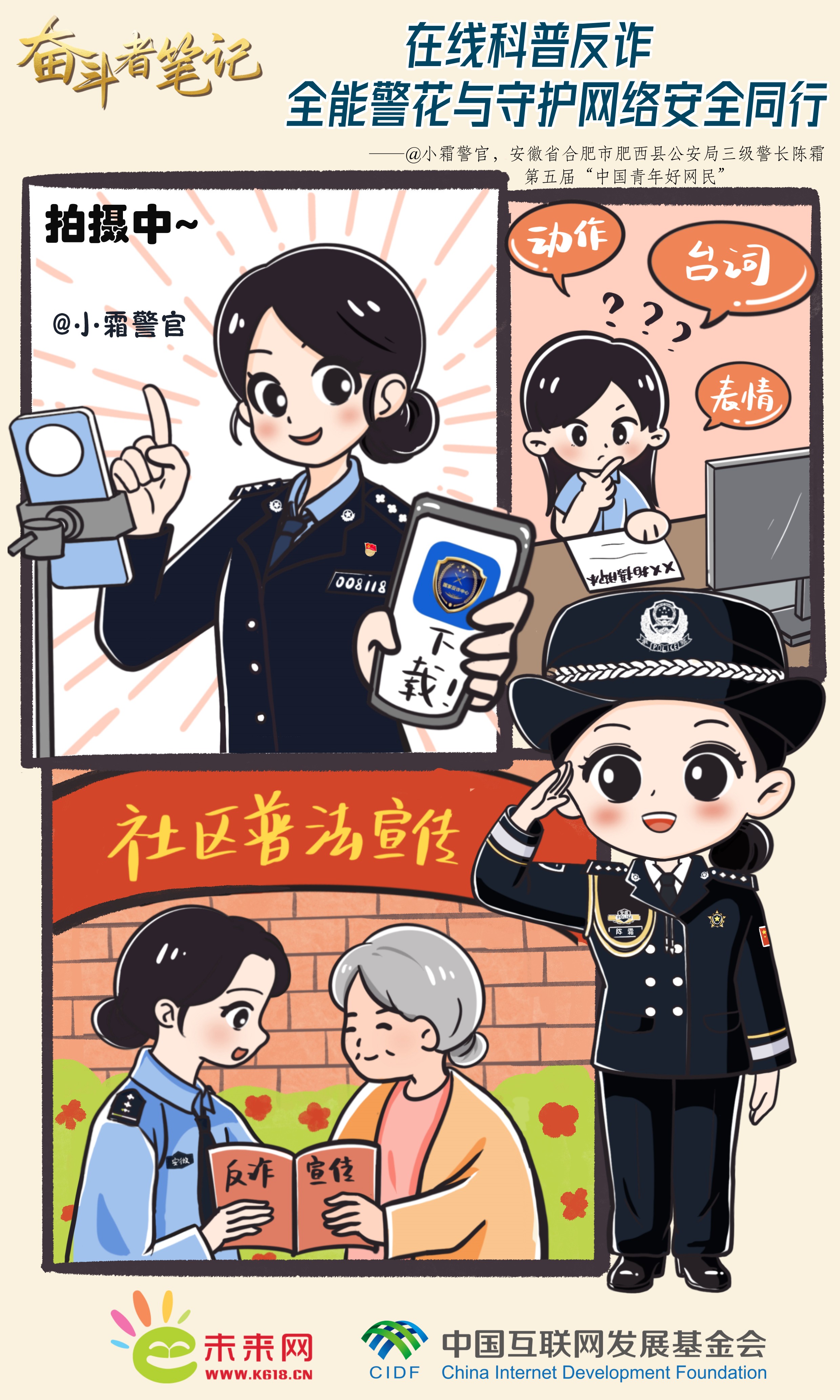 在線下,陳霜積極參加反詐宣傳活動,走進(jìn)社區(qū)、學(xué)校,面對面為百姓講解反詐技巧,讓反詐宣傳更加深入人心。她還出現(xiàn)在央視《社會與法》、共青團(tuán)中央《團(tuán)團(tuán)微課:青少年網(wǎng)絡(luò)素養(yǎng)公開課》等節(jié)目錄制現(xiàn)場,以及中國網(wǎng)絡(luò)文明大會、中國網(wǎng)絡(luò)視聽大會等會議活動中,分享交流寶貴經(jīng)驗,借助大平臺影響力不斷拓寬新媒體時代反詐宣傳新陣地,為構(gòu)建更加安全的網(wǎng)絡(luò)環(huán)境貢獻(xiàn)著青春力量。