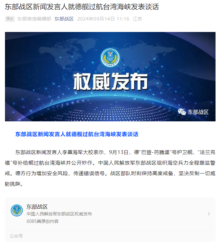 東部戰(zhàn)區(qū)新聞發(fā)言人李熹海軍大校表示,9月13日,德“巴登-符騰堡”號護衛(wèi)艦、“法蘭克福”號補給艦過航臺灣海峽并公開炒作。中國人民解放軍東部戰(zhàn)區(qū)組織??毡θ谈O(jiān)警戒。德方行為增加安全風險、傳遞錯誤信號。戰(zhàn)區(qū)部隊時刻保持高度戒備,堅決反制一切威脅挑釁。
