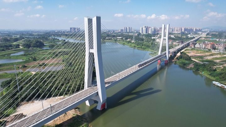 2023年9月26日,廣汕高鐵正式開通運(yùn)營(yíng),列車經(jīng)過(guò)位于廣州市增城區(qū)的廣汕高鐵增江特大橋(無(wú)人機(jī)照片)。新華社記者 田建川 攝