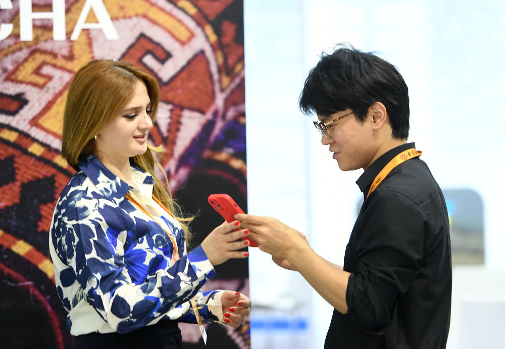9月15日,在服貿(mào)會(huì)國(guó)家會(huì)議中心展區(qū),阿塞拜疆展臺(tái)的參展商(左)與一名中方工作人員交流。新華社記者 逯陽 攝