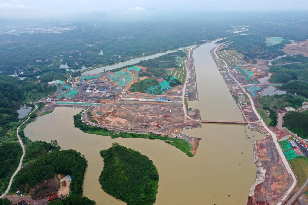 這是施工建設(shè)中的廣西平陸運(yùn)河青年樞紐(2023年8月1日攝,無人機(jī)照片)。新華社記者 陸波岸 攝
