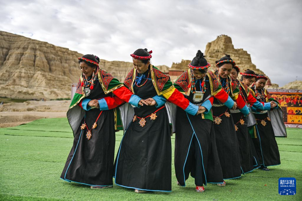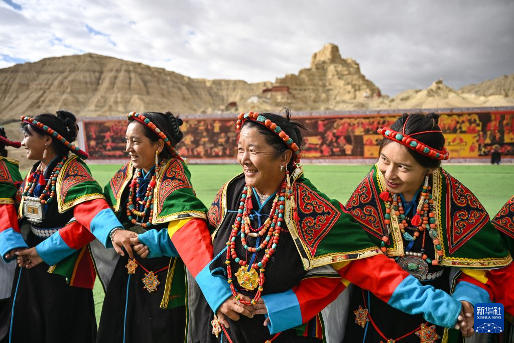在西藏阿里地區(qū)札達縣古格王國遺址腳下,自治區(qū)級“宣舞”非遺傳承人央金(右)介紹“宣舞”(9月11日攝)。