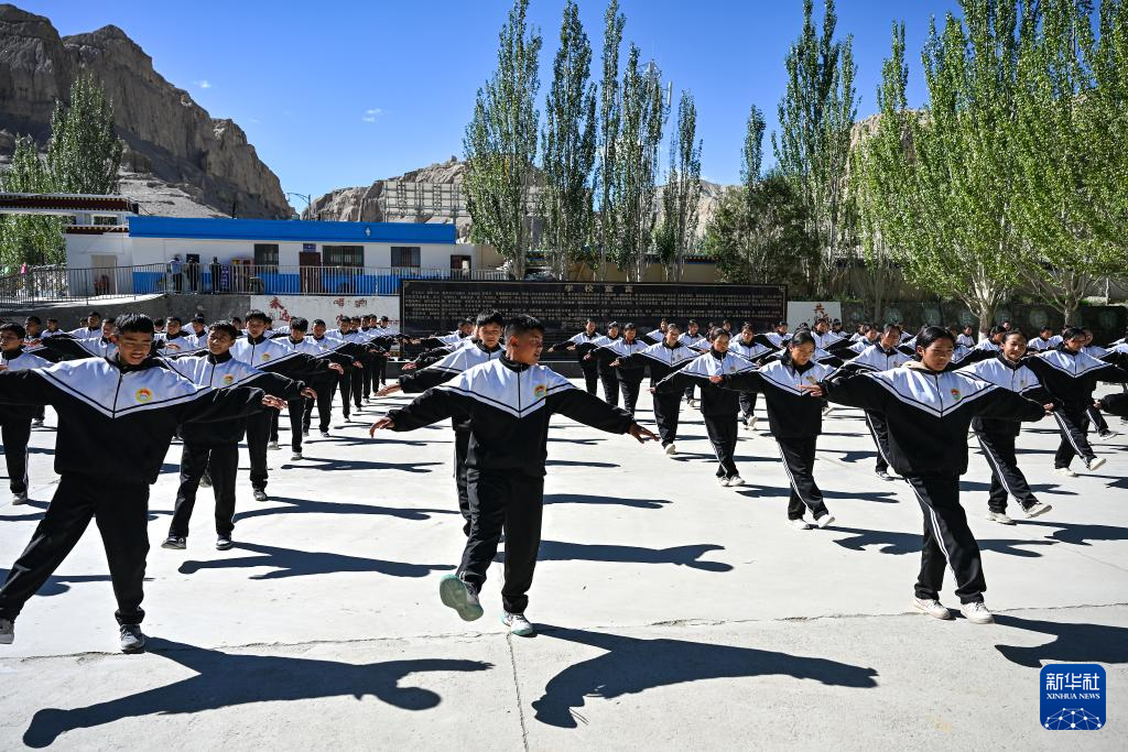在西藏阿里地區(qū)札達縣九年一貫制學(xué)校,學(xué)生們跳起融入“宣舞”特色的課間操(9月10日攝)。